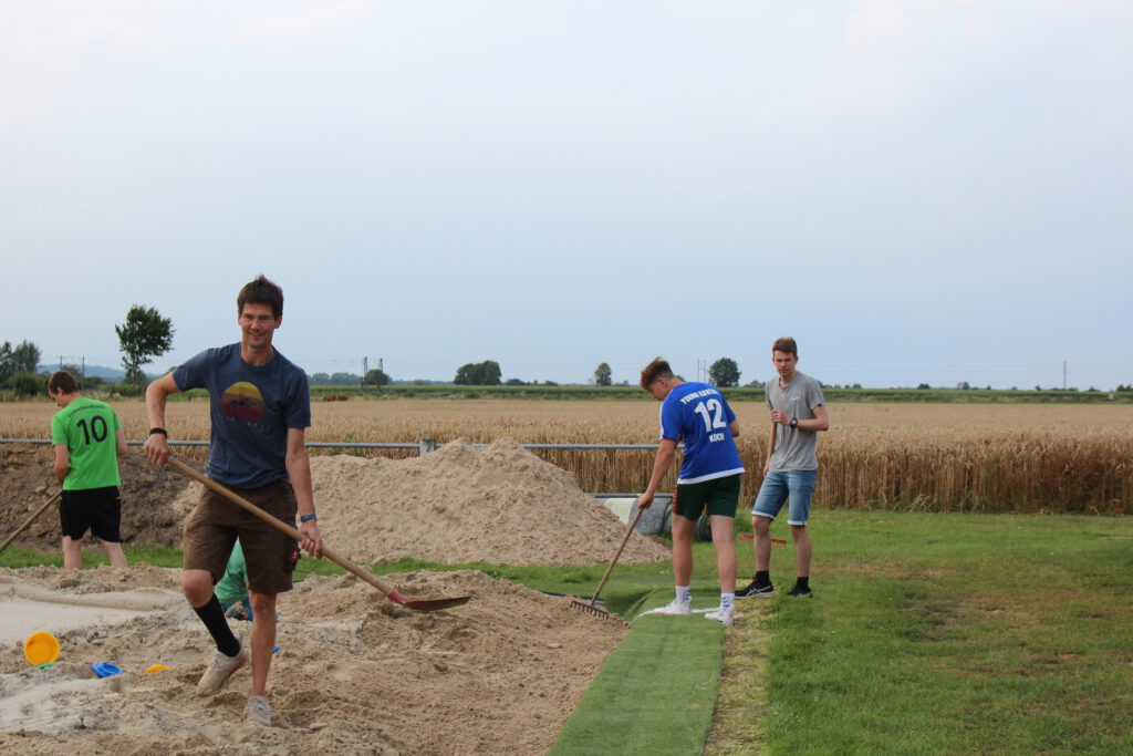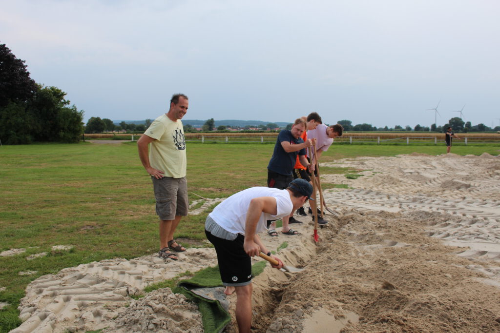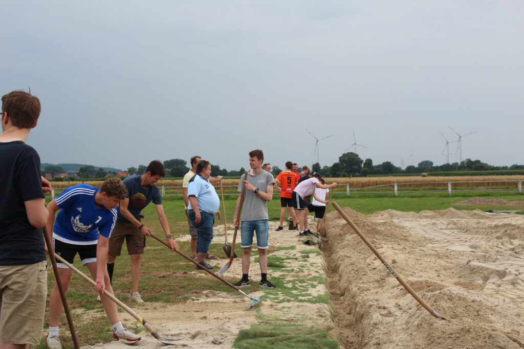 Mit einem großen Arbeitseinsatz, bei dem Spieler der 2., 3. und 4. Herren, sowie der A-Jugend beteiligt waren, wurde am Dienstagabend der Sandplatz in Hohnhorst spielbereit gemacht. Der Sand ist begradigt, die Tore stehen und die Linien bilden das Spielfeld ab. Auch wenn die Arbeiten durch einen Regenschauer unterbrochen wurden, konnte der Platz erfolgreich hergerichtet werden. Im Anschluss an die Sandarbeiten saßen die Helfer bei einem Kaltgetränk und Bratwurst zusammen.