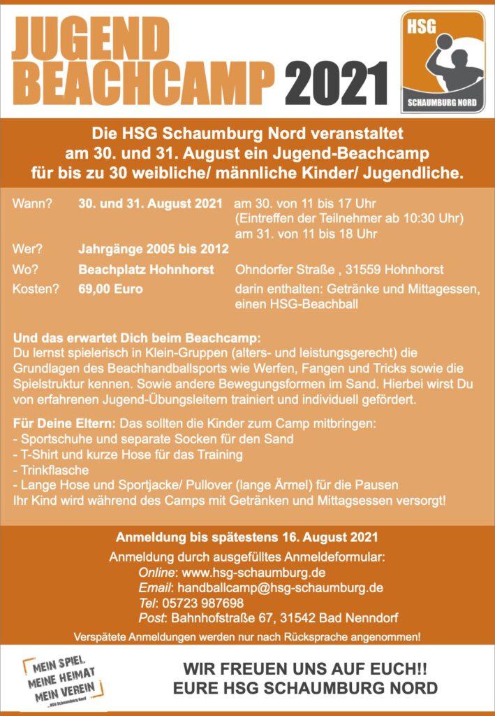 Wir veranstalten am 30. bis zum 31. August ein Jugend-Handball-Camp für Jungen und Mädchen für die Jahrgänge 2005 bis 2012. Sowohl HSG Spieler/innen, als auch vereinsfremde Spieler/innen können teilnehmen. Die Teilnehmerplätze sind auf 30 Kinder/ Jugendliche beschränkt. Dabei entscheidet die Reihenfolge der Anmeldungen über die Teilnahme.