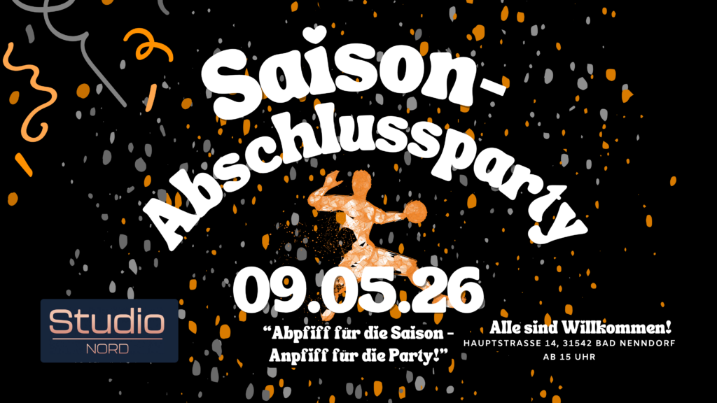 wir freuen uns, euch alle herzlich zu unserer gemeinsamen Saisonabschlussfeier am 09.Mai im Studio Nord (Hauptstraße 14, Bad Nenndorf) begrüßen zu dürfen. Hinter uns liegt eine intensive, emotionale und in vielerlei Hinsicht erfolgreiche Spielzeit – mit spannenden Spielen, großem Einsatz und echtem Teamgeist in allen Altersklassen.